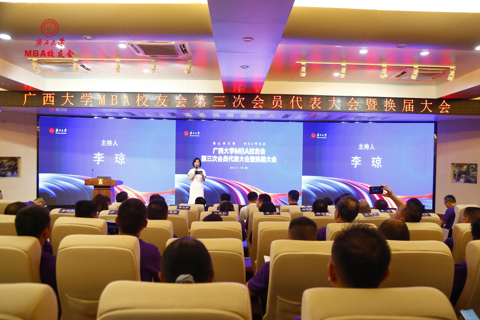 区直员工会代表甘向群、MBA员工代表张程在大会上发言。广州、深圳、区直、南宁市、柳州、桂林、玉林、梧州、贺州、贵港、百色、崇左、SMBA等员工会,EMBA同学会,员工足球协会、乒乓球协会、排球协会等员工代表,以及香港浸会大学MBA、中山大学MBA、暨南大学MBA、深圳大学MBA等嘉宾代表皆到场祝贺。大会还收到了各地兄弟员工会、员工发来的祝贺视频和贺信贺词。最后,换届大会在嘹亮的校歌声中圆满结束。