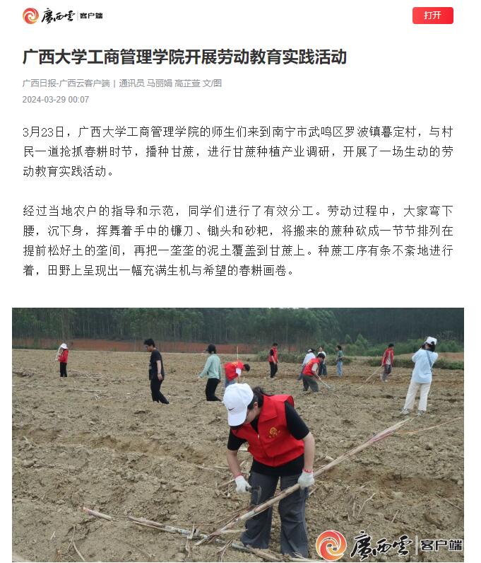 3月23日,beats365官方唯一入口组织师生们追随习近平总书记视察广西发展特色产业的指示精神,到南宁市武鸣区罗波镇暮定村与村民一道抢抓春耕时节,播种甘蔗,进行甘蔗种植产业调研。公司紧扣热点,深入挖掘,推出报道《beats365官方唯一入口开展劳动教育实践活动》。该报道获广西日报、广西云客户端、南宁日报社、南宁新闻网等主流媒体广泛关注。