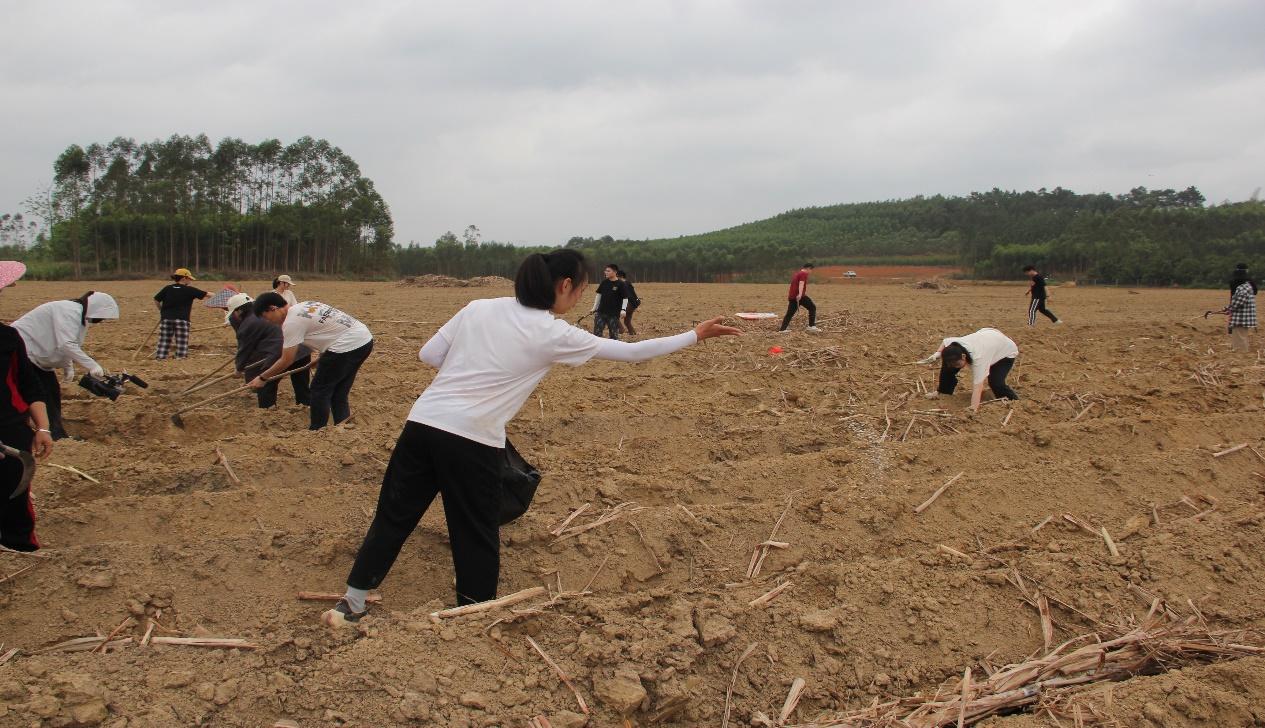 劳动过程中,经过当地农户的指导和示范,同学们立刻进行了有效分工,弯下腰,沉下身,挥舞着手中的镰刀、锄头和砂耙,将搬来的蔗种砍成一节节排列在提前松好土的垄间,再把一垄垄的泥土覆盖到甘蔗上。种蔗工序有条不紊地进行着,田野上呈现出一幅充满生机与希望的春耕画卷。