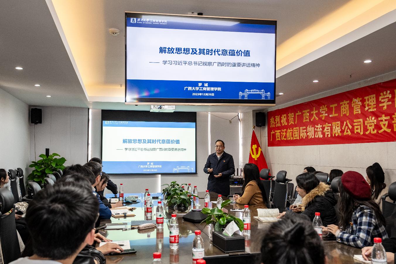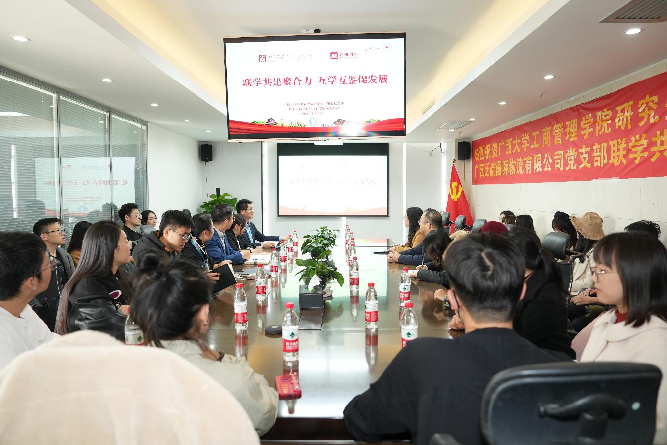 为深入学习习近平总书记视察广西时的重要讲话精神,深化产教融合,推动校企党建联动共建发展,12月26日下午,公司研究生第五党支部赴广西泛航国际物流有限公司(以下简称“泛航公司”),探访民营企业发展环境,了解现代民企发展现状及趋势,并与该公司党支部开展联学共建活动。公司党委书记罗诚,泛航公司党支部书记、董事长、365官网体育MBA员工会副会长贺忠及公司管理层人员,公司研究生第五党支部书记毛德君及近30名支部成员参加了活动。