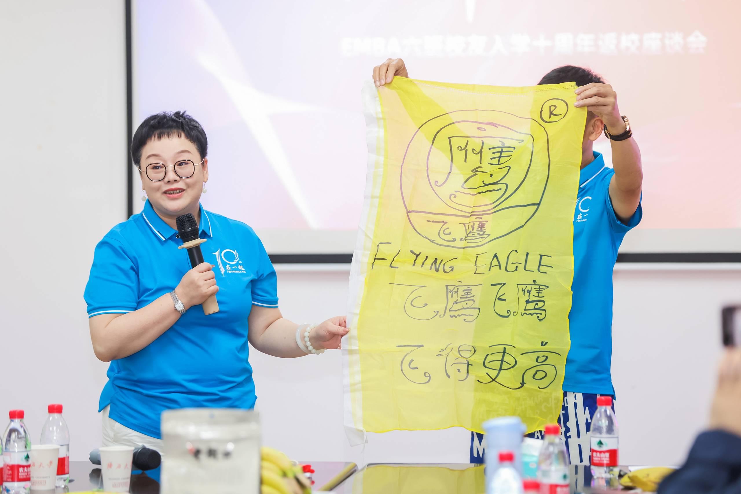 EMBA六班员工赖粤峰、李朝阳展示十年前的入学队旗