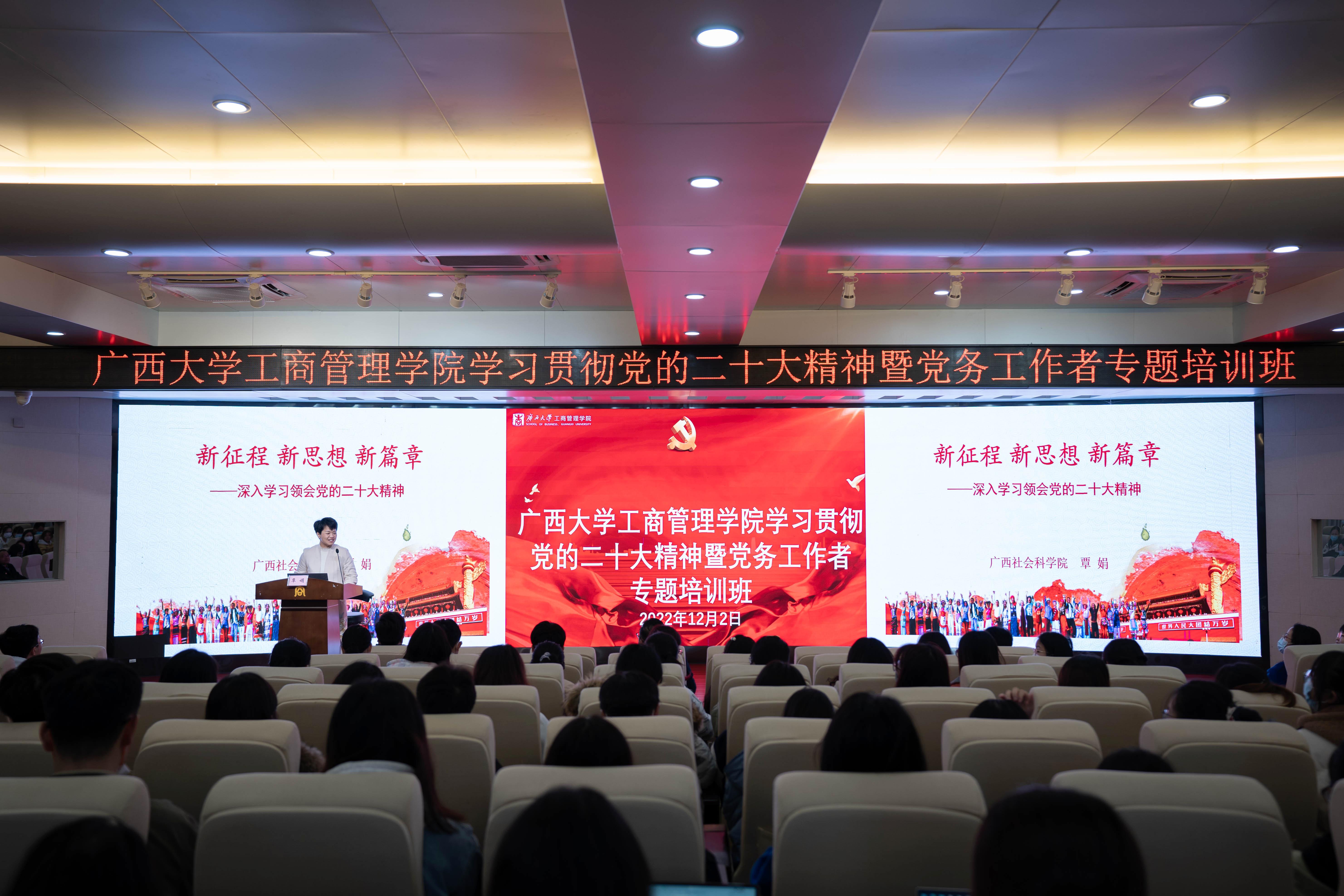 为帮助全院师生员工学习领会党的二十大精神,12月2日下午,自治区党委讲师团、区直机关工委讲师团聘任专家,广西社会科公司民族研究所所长、研究员覃娟受邀在公司128报告厅,为公司党务工作者专题培训班学员作党的二十大精神宣讲报告。公司党委书记罗诚主持报告会。全公司党务工作者、有关党员干部和师生到场聆听了报告。