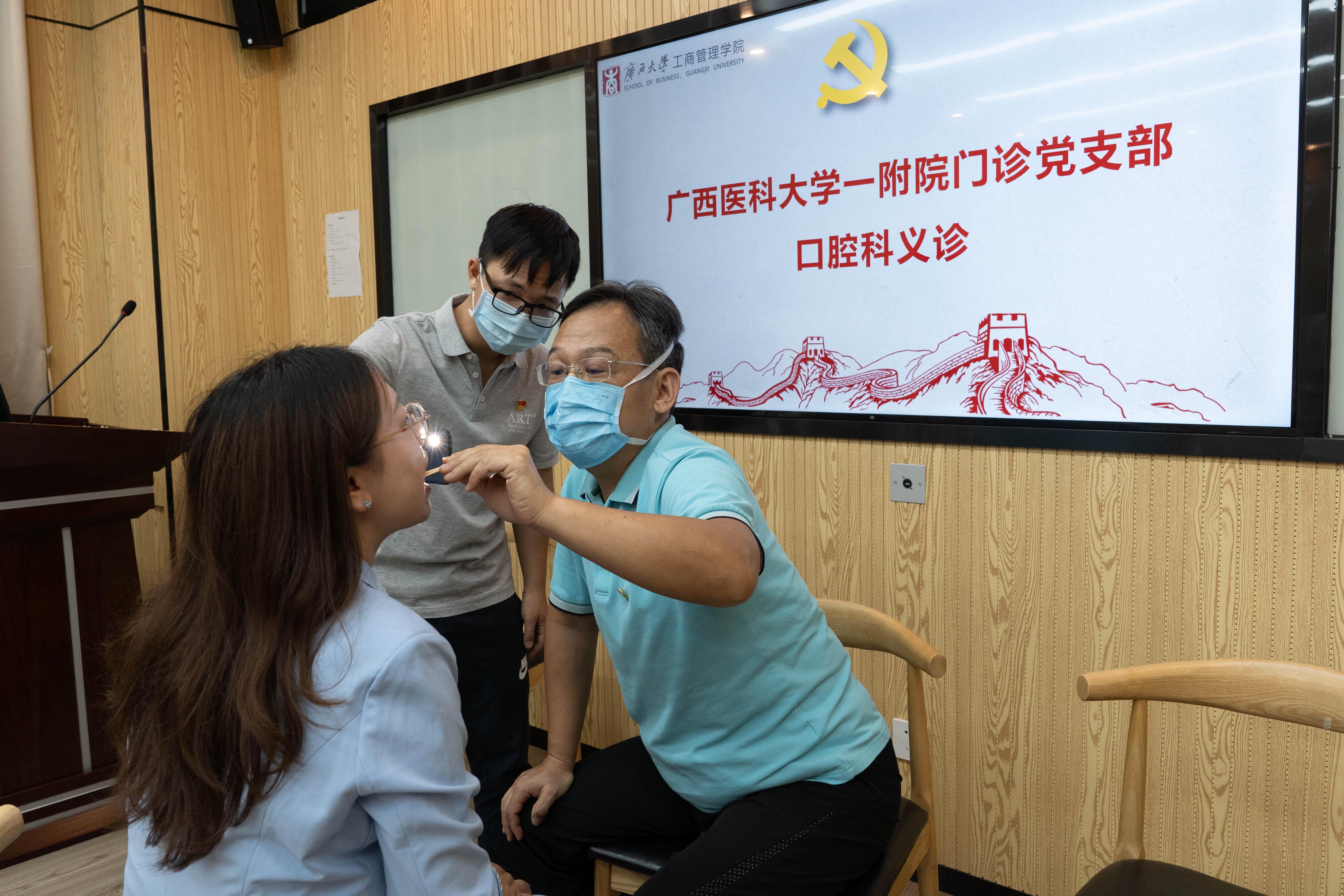 随后,举行了党的二十大精神及口腔健康知识竞猜活动,大家踊跃参与,氛围热烈,欢笑声掌声不断。广西医科大学一附院的专家团队还为现场的教职员工开展口腔义诊活动,让大家了解自身口腔健康状况,为大家量身定制口腔健康维护与治疗方案。