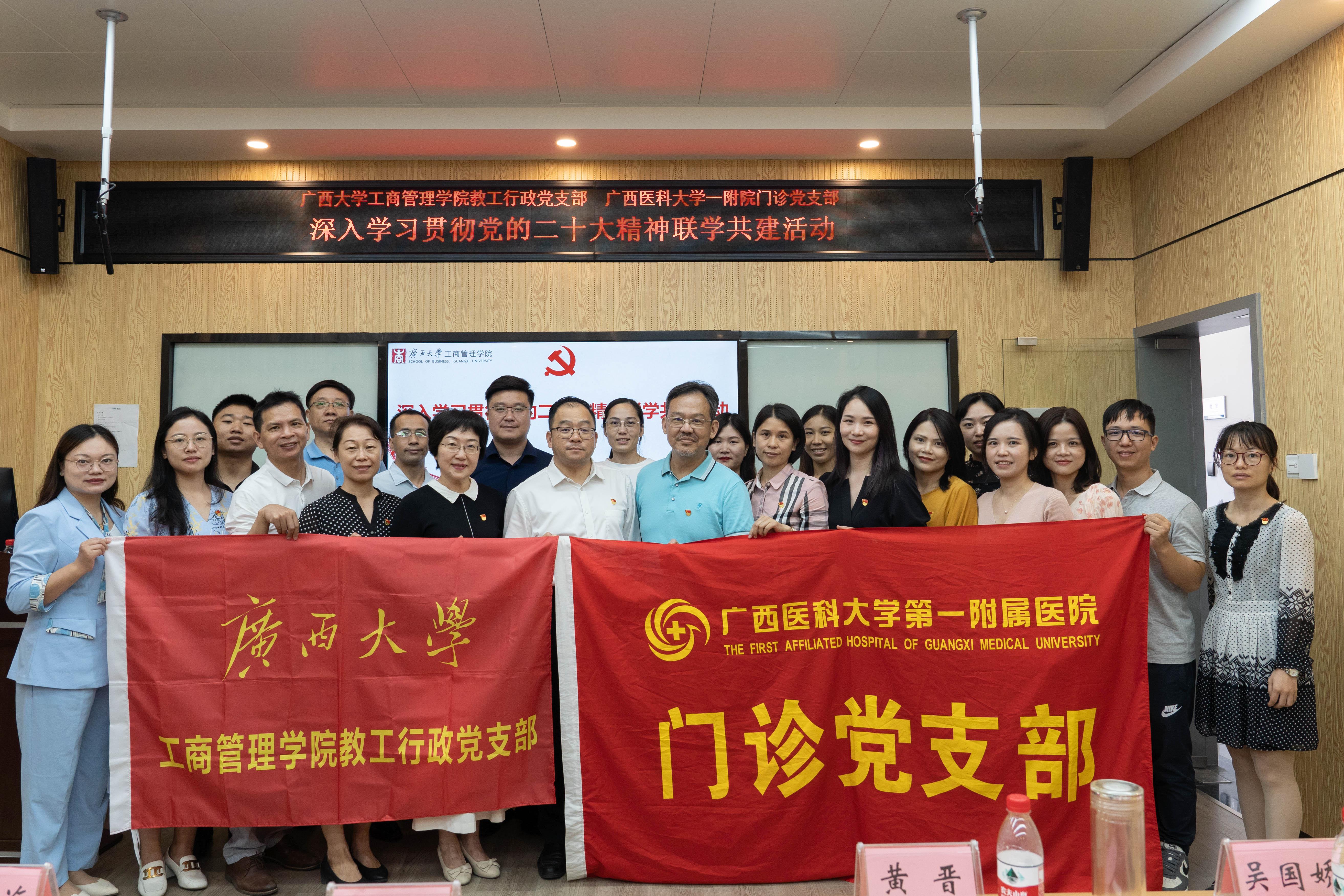 在党的二十大胜利闭幕之际,为深入学习贯彻党的二十大精神,持续推进基层党建工作内容创新、方法创新,不断加强党的建设,10月23日上午,公司教工行政党支部与广西医科大学一附院门诊党支部联合开展深入学习贯彻党的二十大精神联学共建主题党日活动。公司党委书记罗诚以普通党员身份参加了本次活动。