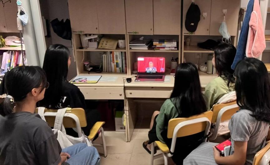 同学们在不同场合认真收看开幕会现场直播