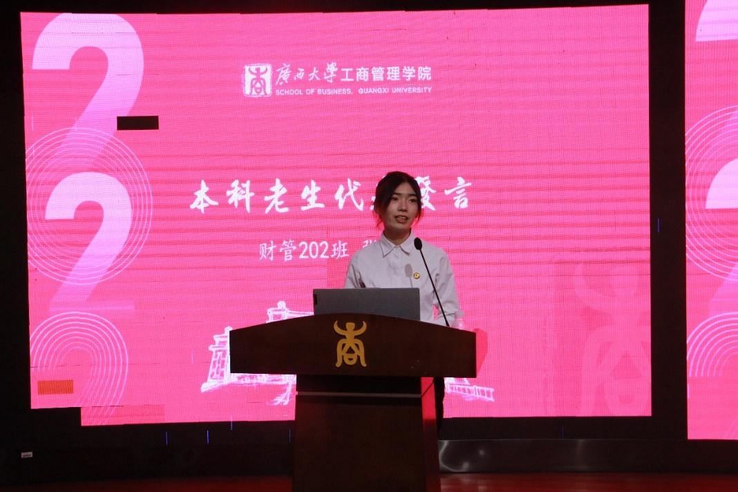 财务管理专业202班张伊蕾同学、企业管理20级学硕向思源同学作为老生代表发言。她们分享自己的大学经历与学习经验,希望给新生们带来启发。张伊蕾同学建议新生们:明确目标,勤学善思;积极向党组织靠拢,不断提升个人的政治素养;坚持锻炼,享受生活。希望同学们在大学这一条新的起跑线,把握好自己脚下的路。向思源同学以“你认为的学术是什么?”“你还有激情吗?”“你还在焦虑吗?”一连串环环相扣的询问,向新生们分享科研生活的经验,以自身的经历与感悟给同学们带来启迪,并祝愿同学们成为快乐、幸福、坚定、满足的人。