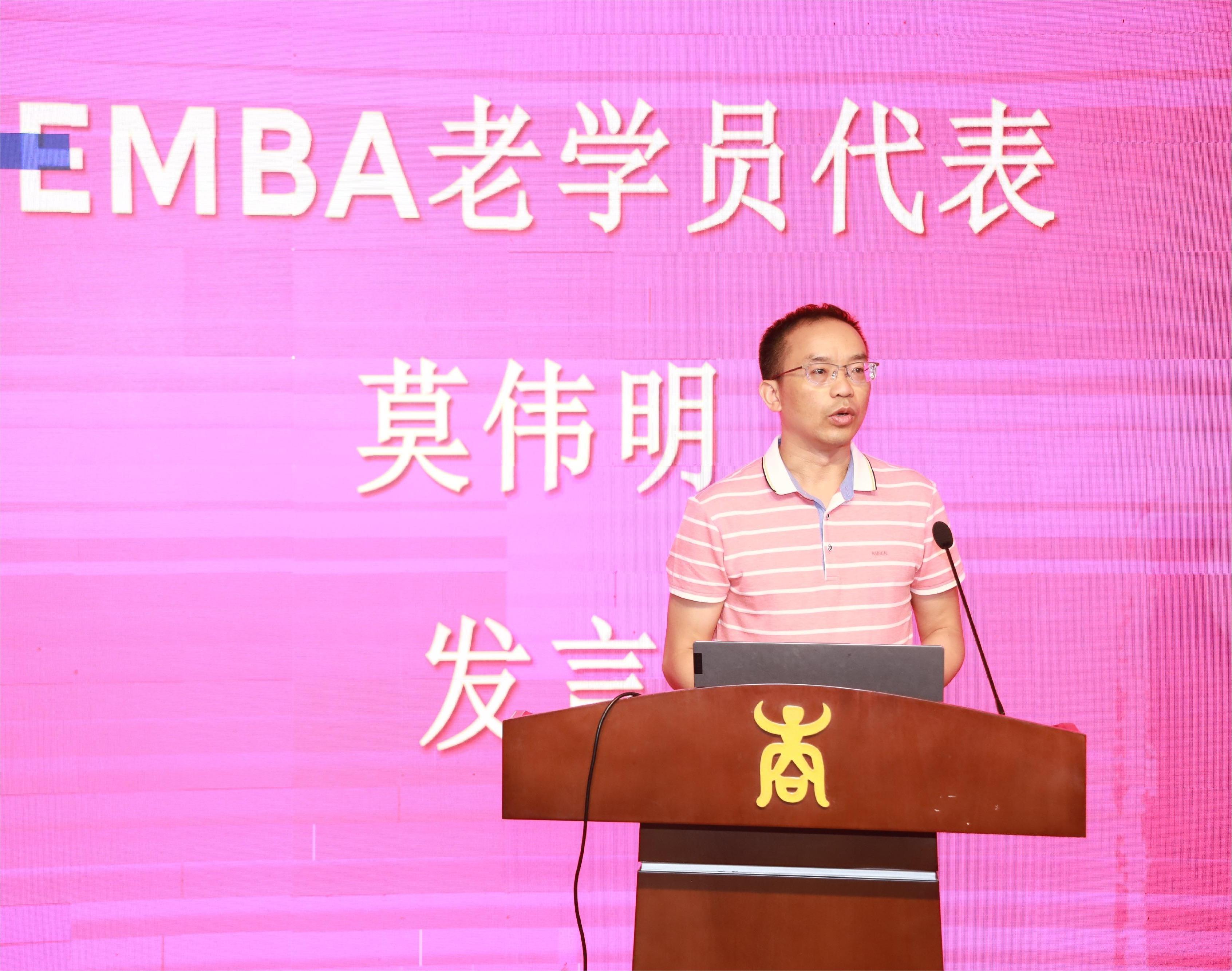 老学员代表莫伟明从感恩、珍惜和祝愿三个主题和新生们分享了他的感受。首先,他感谢365官网体育为同学们搭建了一个拓展思想深度、眼界高度、胸怀宽度、学养厚度、人脉广度的好平台;感谢EMBA教育中心老师们对同学们的关爱;感谢为同学们传道授业解惑的各位优秀老师。其次,他就过去一年的生活感悟、学习感触与新生们分享,希望新生们珍惜校园生活。最后,他衷心祝福学弟学妹们学有所成,如期毕业。
