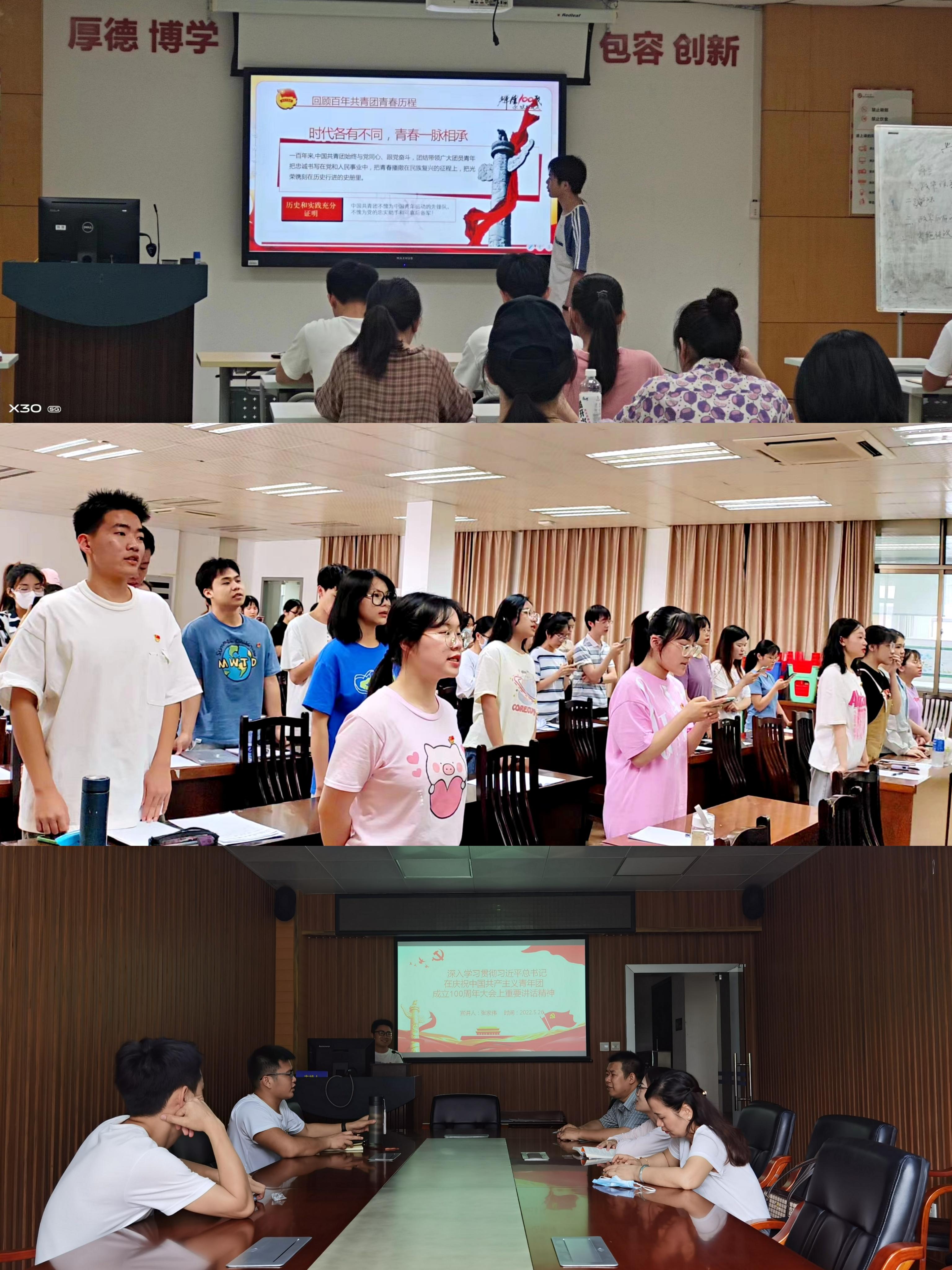 本科生第一、第二、第三党支部以集体朗读原文的形式深入学习领会习近平总书记在中国共产主义青年团成立100周年大会上的重要讲话精神。博士生党支部、研究生第三、第五党支部和本科生第四党支部则以党课形式开展学习活动,共同感受习近平总书记对新时代中国青年的殷切期望。新时代的中国青年,生逢其时、重任在肩,施展才干的舞台无比广阔,实现梦想的前景无比光明!