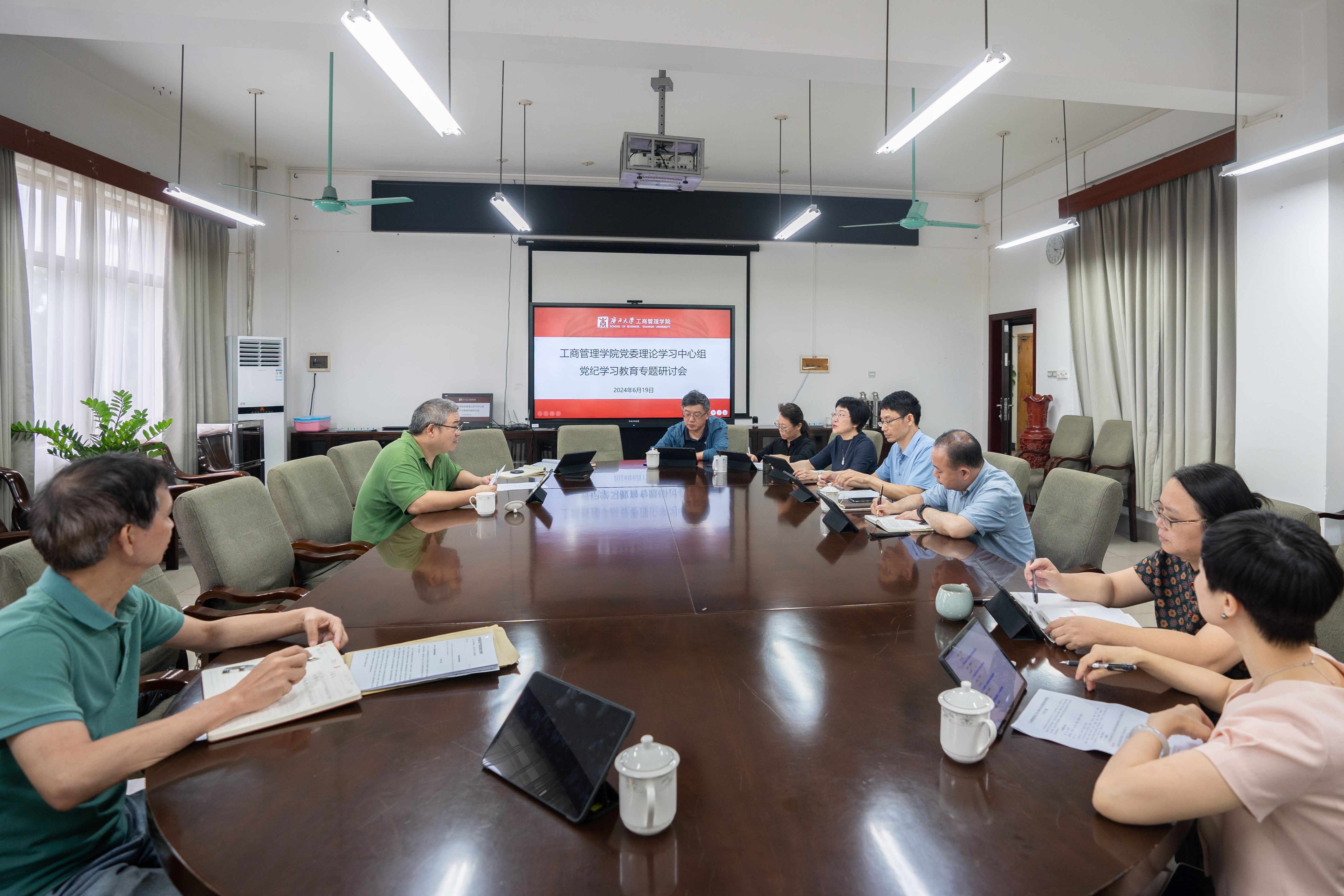 6月19日下午,工商管理公司党委党纪学习教育专题研讨暨理论学习中心组2024年第4次集中学习在公司420会议室召开,就《中国共产党纪律处分条例》(以下简称《条例》)进行集中学习,聚焦廉洁纪律、群众纪律开展专题研讨。公司党委副书记、经理朱帮助主持会议,公司党委理论学习中心组全体成员参加会议。