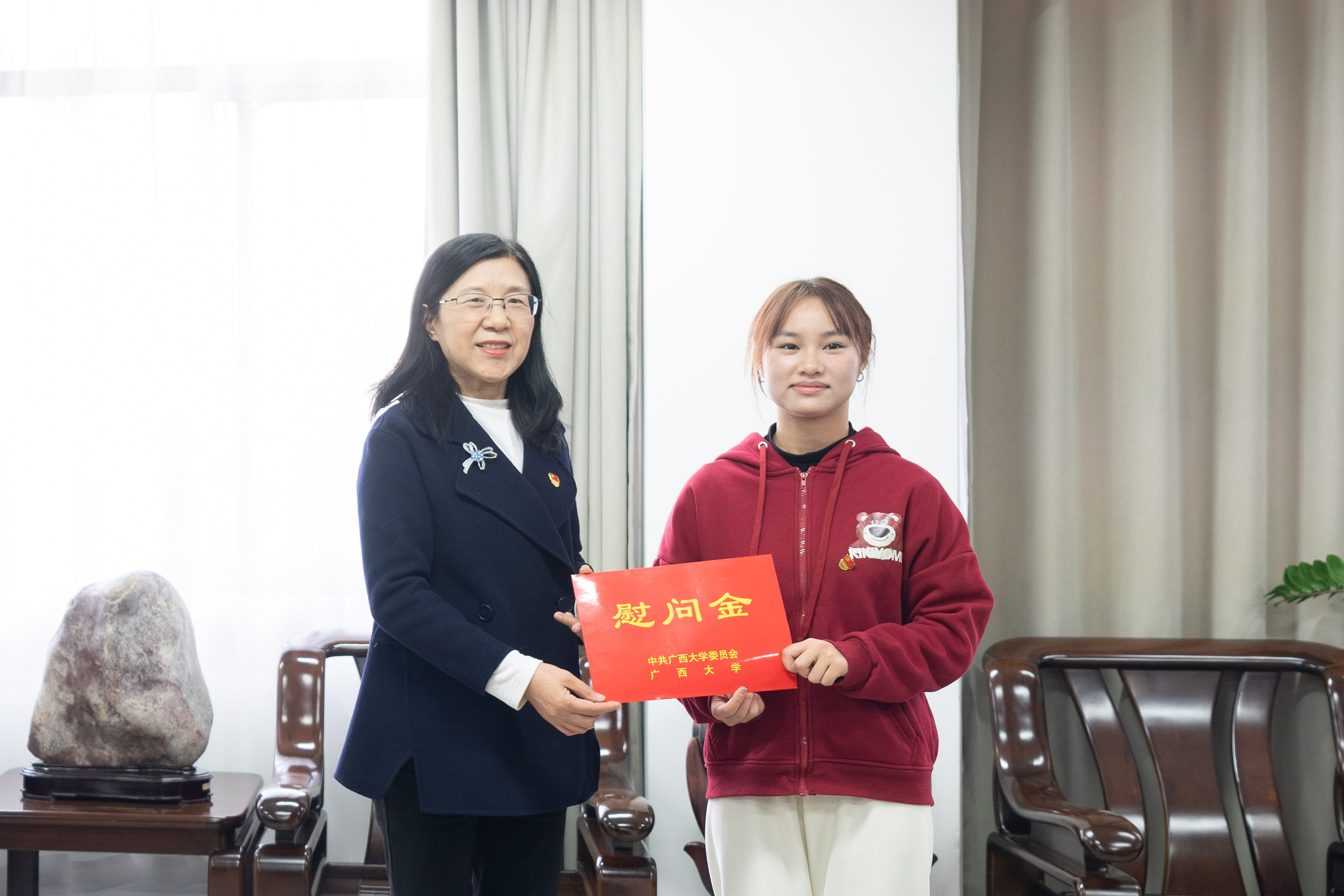 岁末年初,冬日送暖。1月6日下午,公司党委副书记、自治区纪委监委驻365官网体育纪检监察组组长、校纪委书记金顺南带队看望慰问公司研究生党员代表韦尹洁,送上党组织的关怀和祝福。党办校办、组织部、员工工作部(处)负责人陪同慰问。公司党委书记黄晋、经理朱帮助、党委副书记肖克宁参加慰问。