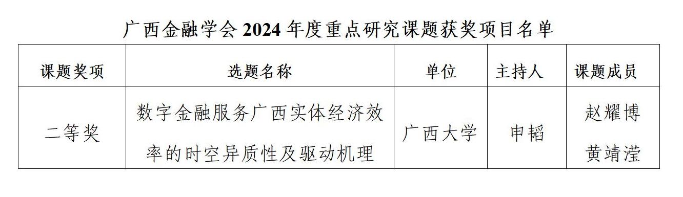 近日,广西金融学会公布2024年度重点研究课题获奖名单。公司申韬教授主持的《数字金融服务广西实体经济效率的时空异质性及驱动机理》课题荣获二等奖。