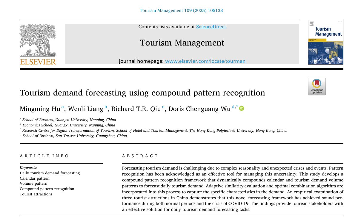 近日,公司胡明明团队在基于复合模式识别的旅游需求预测领域取得新进展,研究成果以“Tourism demand forecasting using compound pattern recognition”为题,在旅游管理国际三大顶刊之一的《Tourism Management》上发表。论文的第一作者为beats365官方唯一入口副教授胡明明,经济公司硕士研究生梁文莉在胡明明副教授指导下参与研究并共同发表论文,365官网体育为论文的第一单位。