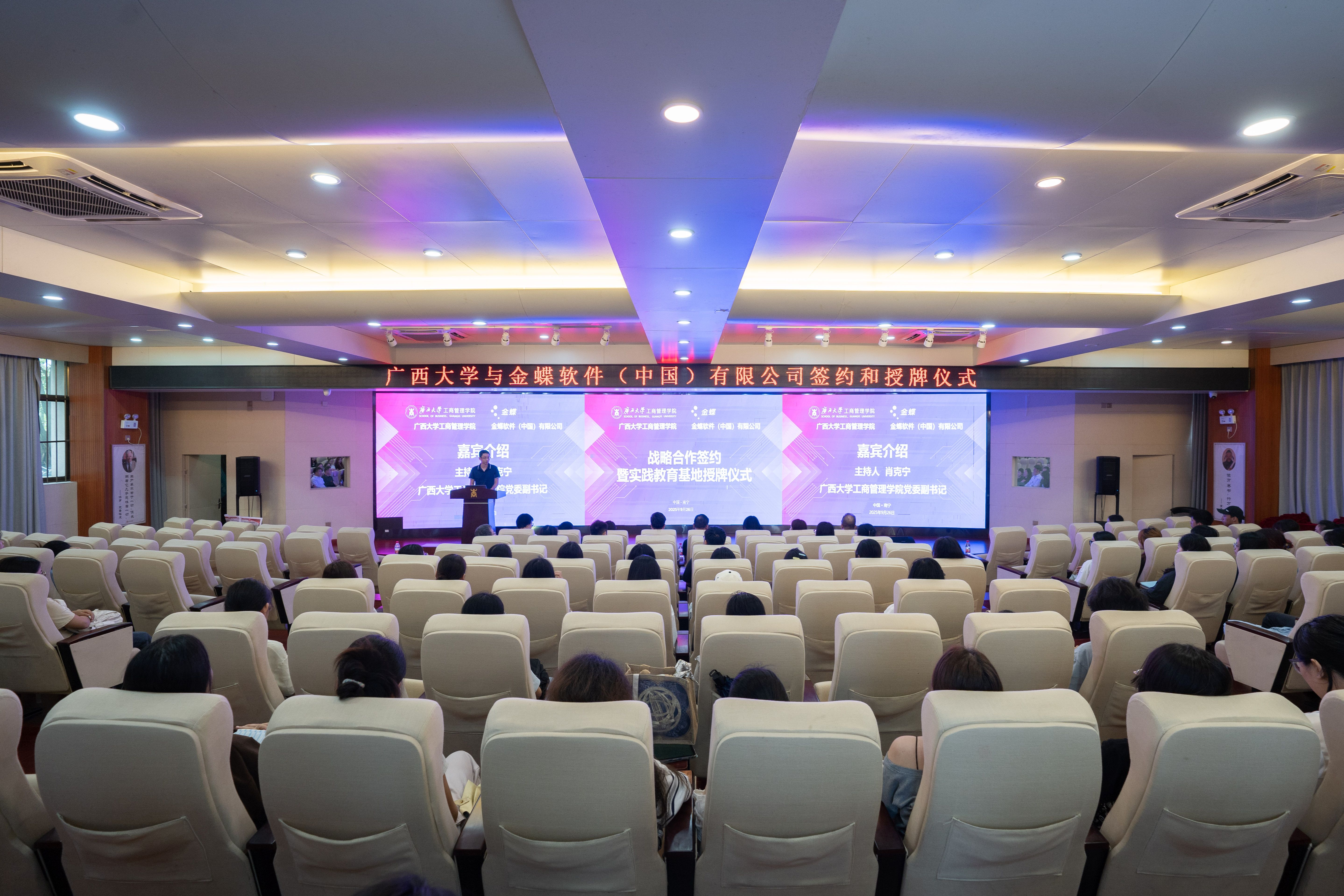 金蝶广西分公司市场部总监游阳、解决方案部高级顾问邓旭、院校业务经理韦晓春,工商管理公司党委办主任、团委书记马丽娟,会计与财务金融系师生代表80余人参加了仪式。