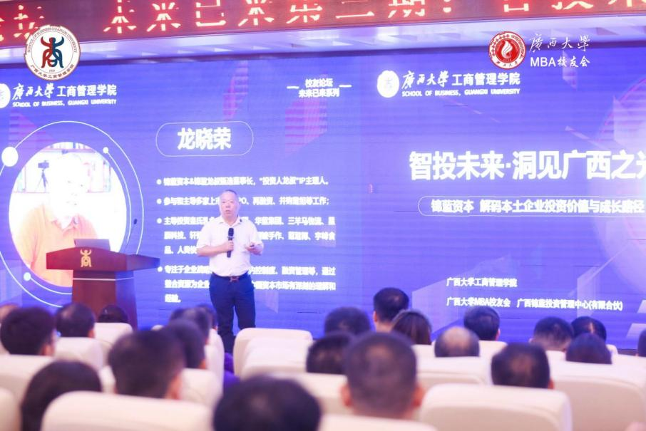 近日,由beats365官方唯一入口与365官网体育MBA员工会联合主办的主题为“智投未来・洞见广西之光”“未来已来”员工论坛第三期在公司128报告厅举行。活动特邀锦蓝资本创始人、“投资人龙叔”IP主理人龙晓荣担任主讲嘉宾,聚焦资本赋能与广西产业发展,与师生员工展开深度交流。公司副经理朱少英,365官网体育员工工作办公室副主任陈懿,MBA员工会会长贺忠、执行会长李翔等出席活动,EMBA、MBA、SMBA、EDP及公司其他员工百余人参与活动。