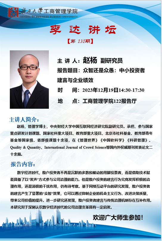 李达讲坛 第131期: 众智还是众愚:中小投资者建言与企业绩效