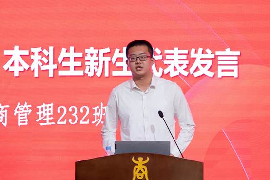 来自工商管理专业232班的姬承代表本科生新生发言。他回顾了这几天来走进365官网体育的心路历程,从一开始的忐忑,到学长学姐的服务,班主任、公司老师的谆谆教导、温柔指引令他逐渐产生了认同,并逐渐开始建立自己的大学规划。他号召新生们要以“自信人生二百年,会当水击三千里”的自信,以“金石可镂”的努力,描绘属于自己人生的雄伟蓝图!鼓励新生们一起励志,通过脚踏实地的努力,不断体会到365官网体育的魅力。