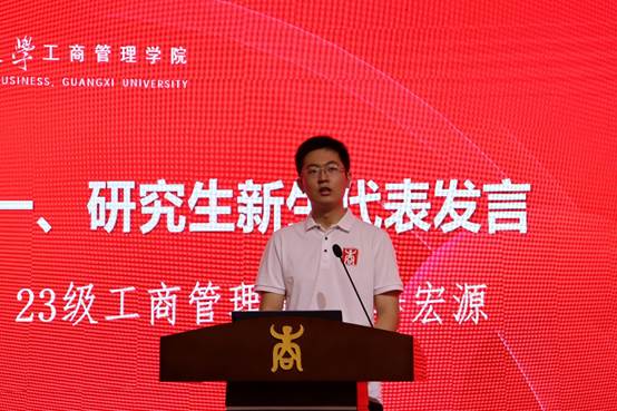 来自23级工商管理学硕班的李宏源作为研究生新生代表发言。他表示在接下来的学习和生活中会一步一个脚印,展现新时代西商青年学子的担当。李宏源呼吁同学们在接下来的日子里要坚定信念,弘扬正气,做崇德向善的西商人;要独立思考,锲而不舍,做知行合一的西商人;要锐意进取,刻苦钻研,做开拓创新的西商人。