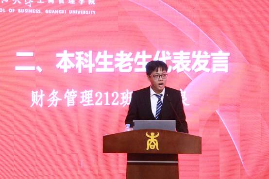 财管212班的吴谨良代表本科生老生发言,他首先代表学长学姐欢迎学弟学妹们的到来,欢迎他们加入公司这个大家庭。接下来他向新生回顾了他大学三年来的经历,在班级、社团组织、团委员工会获得的锻炼,参加“互联网+”、“挑战杯”等学科竞赛,将书本知识运用到理论实践的心得。他向新生建言,立身以立学为先,立学以读书为本,希望他们能不断学习,提升综合素质。同时积极向党组织靠拢、尽快制定适合自己的学业规划和人生目标。