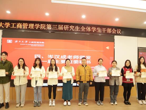 会议共六项议程,会议伊始,院团委副书记岑汉成对上一届团学组织成员的工作给予了高度肯定,并为上一届团学组织主要员工干部颁发聘书。过去一年,团学组织成员们积极开展各方面的工作,展现了公司研究生组织应有的奋进姿态。