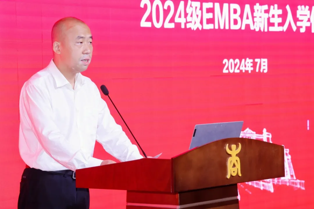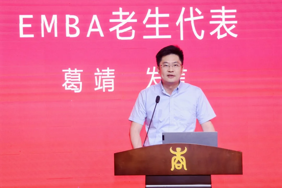 老生代表葛靖代表往届EMBA师兄师姐,对2024级EMBA新生加入EMBA大家庭表示热烈的欢迎。他分享了过去一年EMBA学习期间四个关键词——“挑战”、“勤学”、“交流”、“时间管理”的收获与感悟。最后他祝愿同学们在学习和事业上取得更大的成就,也祝愿公司EMBA项目越办越好。