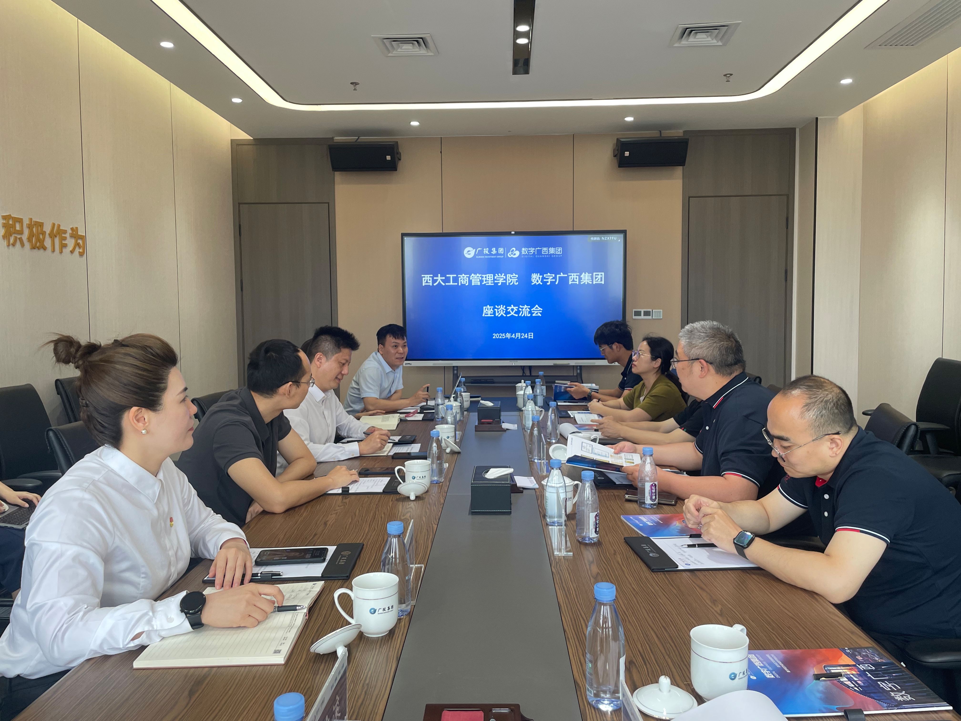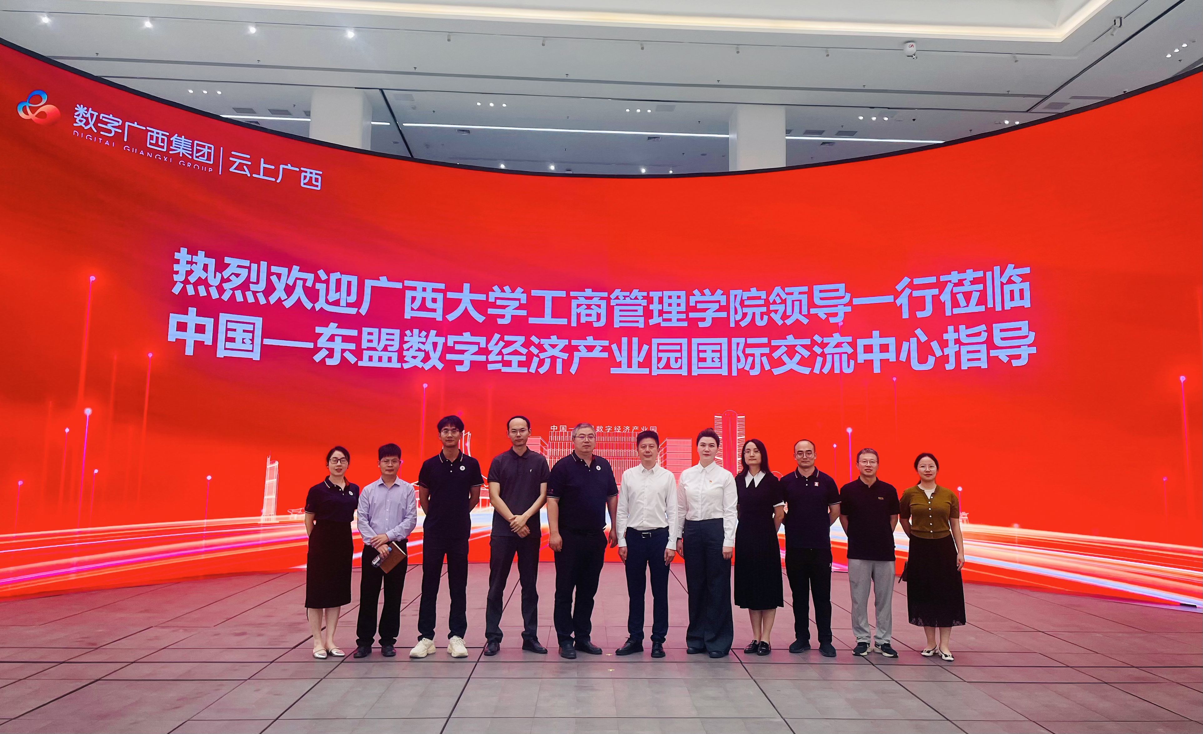 在中国-东盟数字经济产业园,调研组受到广西数广全网融合科技有限公司副总经理周艳(2022级EMBA员工)及云上广西网络科技有限公司董事长刘学(2023级MBA员工)等的热情接待。座谈中,双方围绕重点研发项目联合申报、新能源算力中心、东盟舆情智库建设及数字创新实训基地共建等展开探讨。朱帮助表示,公司将发挥学科优势,助力企业数字化转型,打造服务中国-东盟数字经济发展的产学研标杆,推动“AI+行业”战略深度融合。