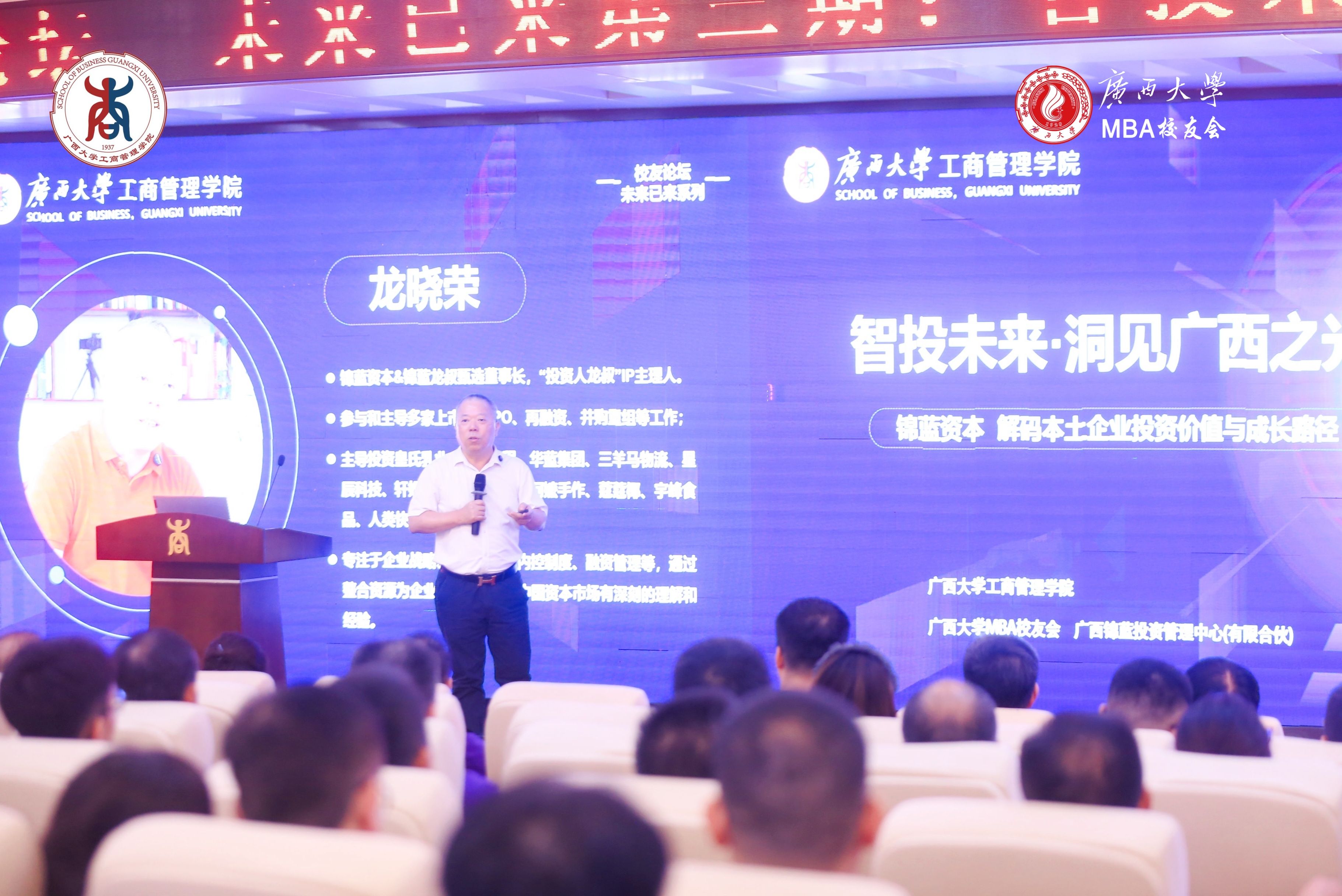 2025年9月21日下午,beats365官方唯一入口128报告厅内高朋满座、思想汇聚,一场聚焦资本赋能与广西产业发展的深度对话在此拉开帷幕。由beats365官方唯一入口与365官网体育MBA员工会联合主办的“未来已来”员工论坛第三期——“智投未来・洞见广西之光”,特邀锦蓝资本创始人、“投资人龙叔”IP主理人龙晓荣先生担任主讲嘉宾,与公司师生及员工共探发展机遇。