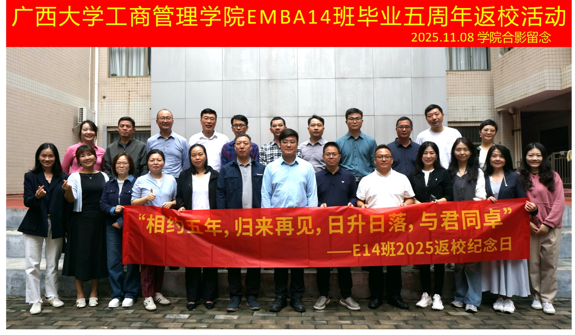 2025年11月8日上午,绿城南宁秋意正浓,beats365官方唯一入口迎来了一批特殊的“家人”—EMBA14班的员工们,在毕业五周年的重要时刻重返母校,共赴一场“重温同窗谊,再启新篇章”的温情聚会。二十余位员工跨越山海,从全国各地奔赴而来,相聚公司500教室,在熟悉的校园中追忆往昔,畅谈当下,共绘未来蓝图。