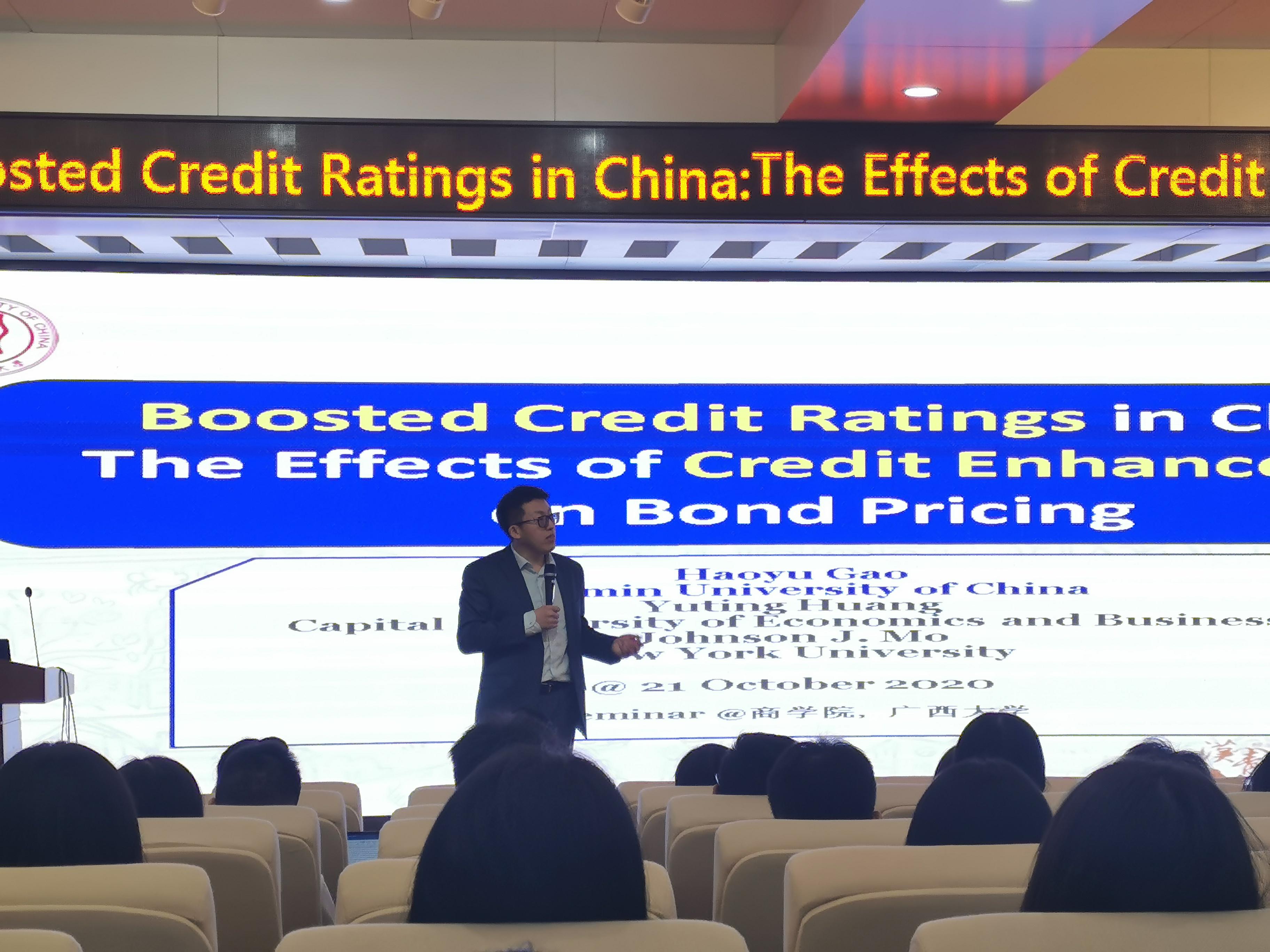 10月21日,中国人民大学汉青经济与金融高级研究院金融系高昊宇副教授应邀来公司进行学术交流,于商公司128报告厅进行了主题为“Boosted Credit Ratings in China: The Effects of Credit Enhancement on Bond Pricing”的学术报告。