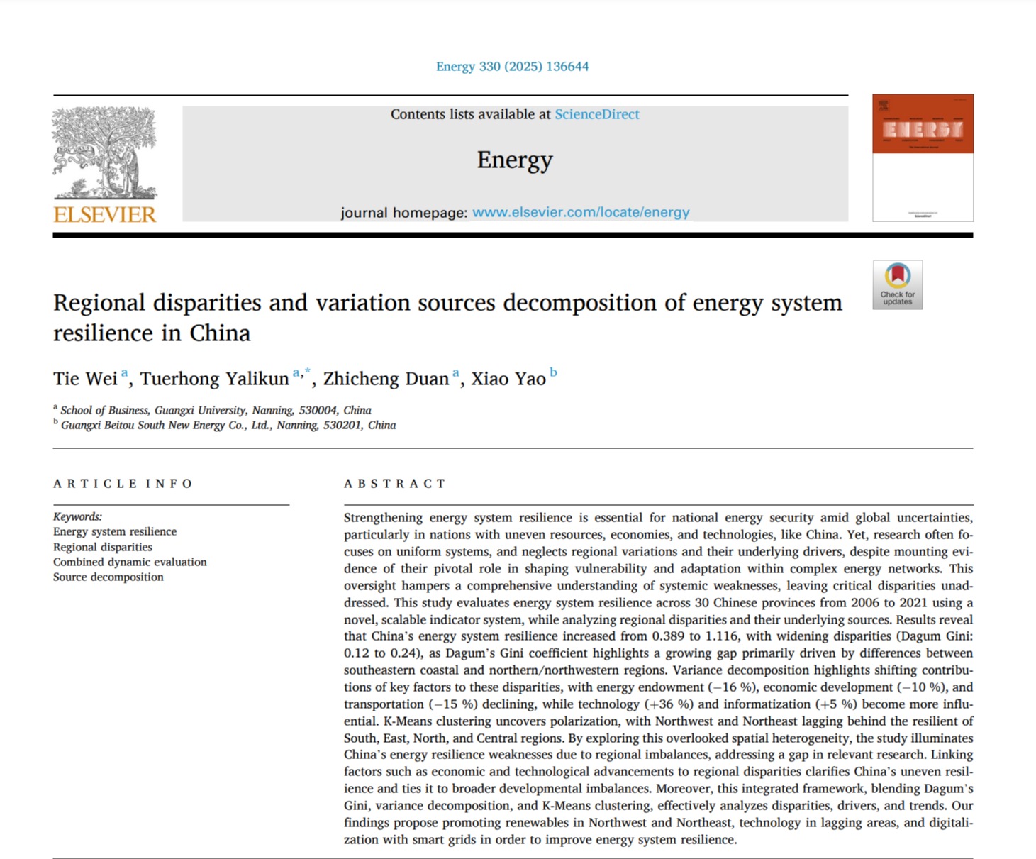 近日,公司韦铁教授团队在我国能源系统领域研究取得重要进展,研究成果《Regional disparities and variation sources decomposition of energy system resilience in China》在能源领域国际权威期刊《Energy》上发表。公司韦铁教授为论文第一作者,论文通讯作者为公司硕士研究生亚力昆·吐尔洪,其他合作作者包括公司博士研究生段至诚和EMBA学员、广西北投南新能源公司姚晓,beats365官方唯一入口为论文第一单位和通讯单位。