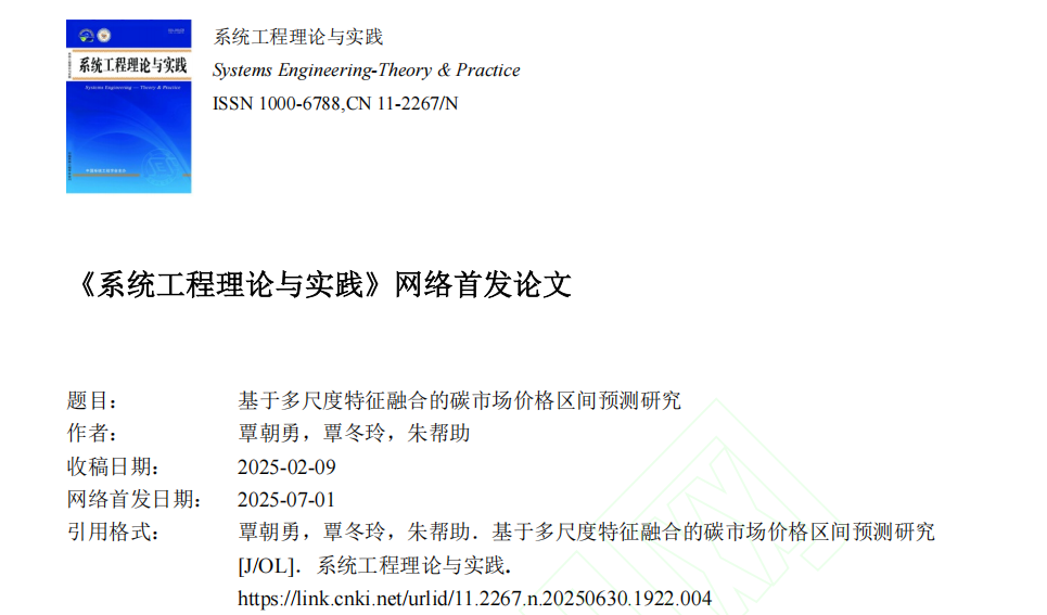 近日,公司覃朝勇教授团队在能源预测领域研究取得重要进展,研究成果《基于多尺度特征融合的碳市场价格区间预测研究》在管理科学与系统工程领域的顶级权威期刊《系统工程理论与实践》上发表。论文第一作者为覃朝勇教授,第二作者为公司硕士研究生覃冬玲,通讯作者为朱帮助教授。beats365官方唯一入口为第一单位和通讯单位。