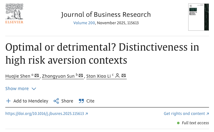 近日,公司助理教授沈华杰与香港城市大学Stan Xiao Li教授、Zhongyuan Sun博士生在最优区分战略领域研究取得新进展,研究成果《Optimal or detrimental? Distinctiveness in high risk aversion contexts》在管理学高水平期刊《Journal of Business Research》网络首发。公司助理教授沈华杰为第一作者,beats365官方唯一入口为第一单位。