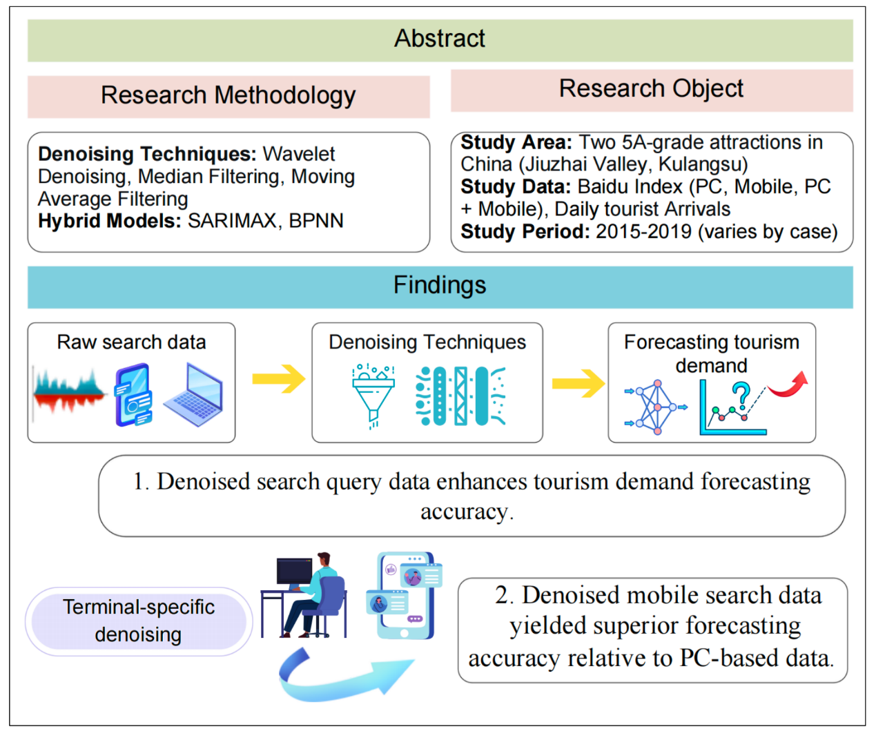 研究团队创新性地提出了一个基于搜索引擎数据去噪的预测框架。该框架首先应用小波去噪、中值滤波与移动平均滤波三种方法,分别对PC端与移动端搜索数据进行降噪处理;结合SARIMAX和BPNN两种预测模型,构建了基于搜索引擎数据降噪的旅游需求预测混合模型。研究以鼓浪屿和九寨沟为实证案例进行验证,结果显示:采用降噪后搜索数据的模型预测性能显著优于基于原始数据的基准模型;移动端搜索数据在去噪后的预测准确性优于PC端数据。该研究进一步证实,在旅游需求预测建模前,对不同终端的搜索数据进行去噪具有重要价值。