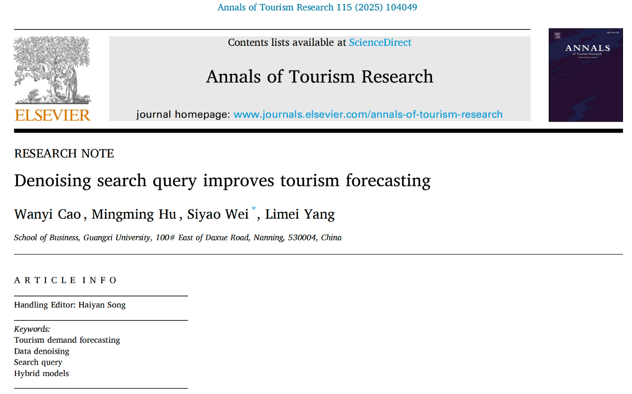 近日,公司旅游管理系胡明明副教授科研团队在旅游需求预测领域研究取得重要进展,相关研究成果以“Denoising search query improves tourism forecasting”为题,在旅游管理领域国际三大顶级期刊之一《Annals of Tourism Research》在线发表。论文第一作者为公司硕士研究生曹婉怡,通讯作者为硕士研究生韦思遥,第二作者为指导教师胡明明副教授,beats365官方唯一入口为第一单位和通讯单位。