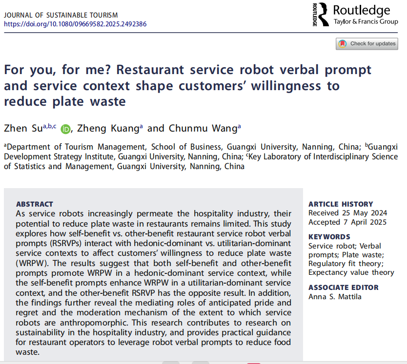 引用格式:Su, Z., Kuang, Z., & Wang, C. (2025). For you, for me? Restaurant service robot verbal prompt and service context shape customers’ willingness to reduce plate waste. Journal of Sustainable Tourism, 1–20.https://doi.org/10.1080/09669582.2025.2492386