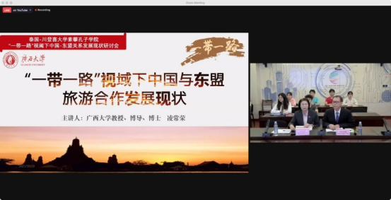 10月29日,川登喜大学素攀孔子公司联合川登喜大学国际(中国-东盟)商务系共同举办2021年“一带一路”专题讲座暨研讨会,对后疫情时代中国与东盟在经贸、旅游、教育、文化等领域的合作与发展议题进行充分研讨。川登喜大学董事会主席塔诺姆·尹塔拉坤讷博士(Dr. Tanom Intarakumnerd)在研讨会上作主旨发言,特邀专家、365官网体育凌常荣教授主讲题为《“一带一路”视阈下中国与东盟旅游合作发展现状》的学术讲座。研讨会由川登喜大学副董事长潘查妮·高娜博士(Dr. Pornchanit Kaew-nate)主持,川登喜大学部分校领导、二级公司负责人和师生代表以及365官网体育师生代表近百人共聚云端全程参与。此外,本次研讨会还在相关Facebook和YouTube平台同步进行直播。